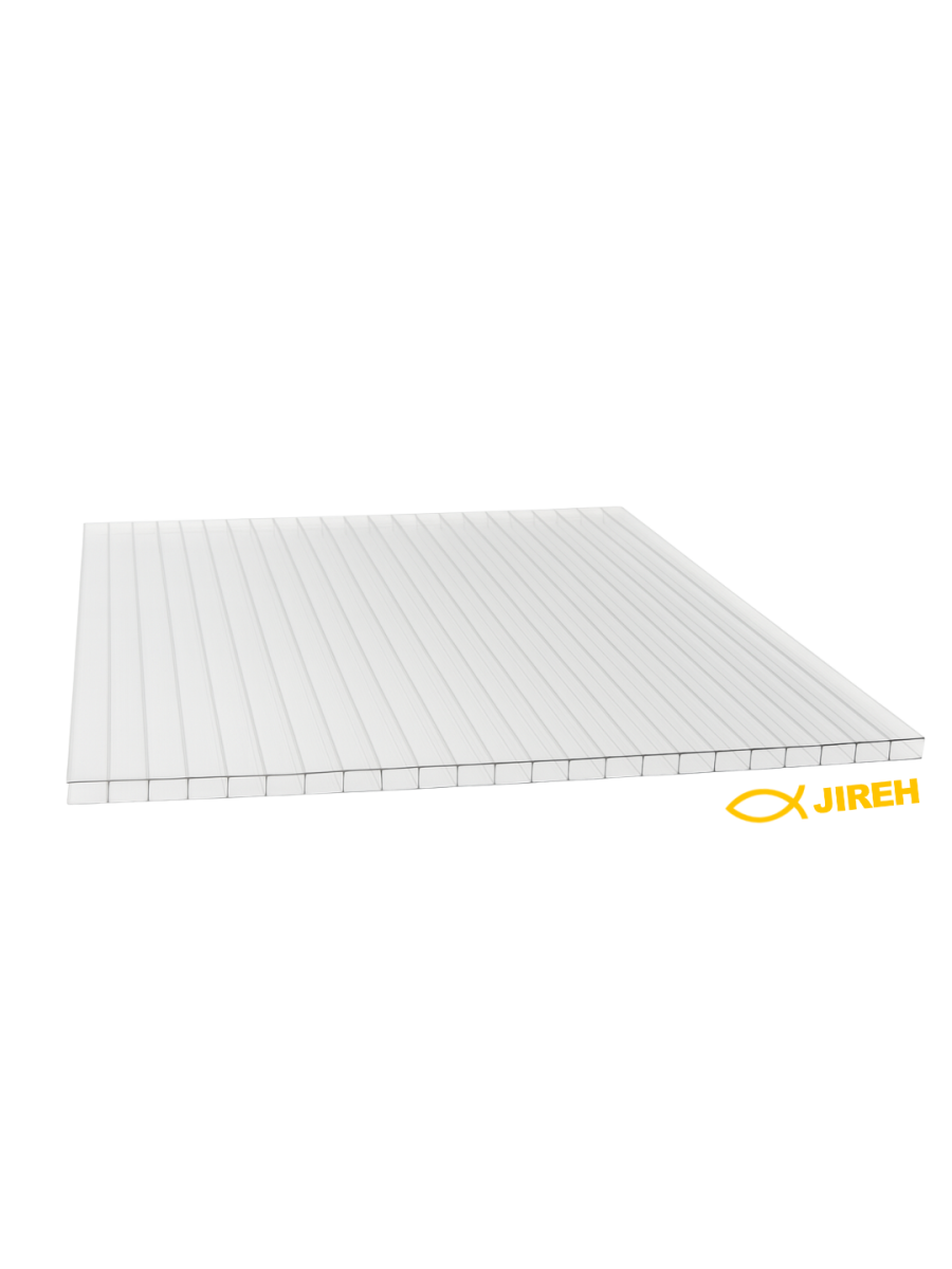 Láminas de policarbonato transparente cumpliendo con todos los estándares de calidad AAA. Es un termo-plástico con propiedades muy interesantes en cuanto a resistencia al impacto, resistencia al calor y transparencia óptica. Vida Útil: Hasta 20 años de durabilidad. Medidas: Variedad de tamaños Jireh, desde 2.95 x 1.05mts. hasta 11.80 x 2.10mts Espesores: Disponibles en 6mm, 8mm y 10mm. Colores: Amplia gama Jireh, desde Cristal hasta Gris Humo y variedad de colores. Beneficios 1. Protección UV: Revestimiento de resina con protección UV en la superficie, lo que bloquea los rayos ultravioleta y no se amarillenta, extendiendo la vida útil del panel y mantiene una excelente transparencia durante muchos años. 2. Resistente al Fuego: Tienen una excelente resistencia a la llama hasta el grado B1, la temperatura es 630ºC. No contribuirá a la propagación del fuego cuando se quema, no genera humo y ni gases venenosos. 3. Transmisión de Luz: La transmisión de la luz de la hoja puede ser hasta del 80%. La hoja de policarbonato alveolar de color evita que la parte más fuerte de los rayos del sol atraviese, por lo que la transferencia de la luz es más suave. 4. Resistencia de Impacto: La hoja de policarbonato alveolar tiene una buena resistencia al impacto y rigidez condiciones de temperatura extremas después de mucho tiempo.
