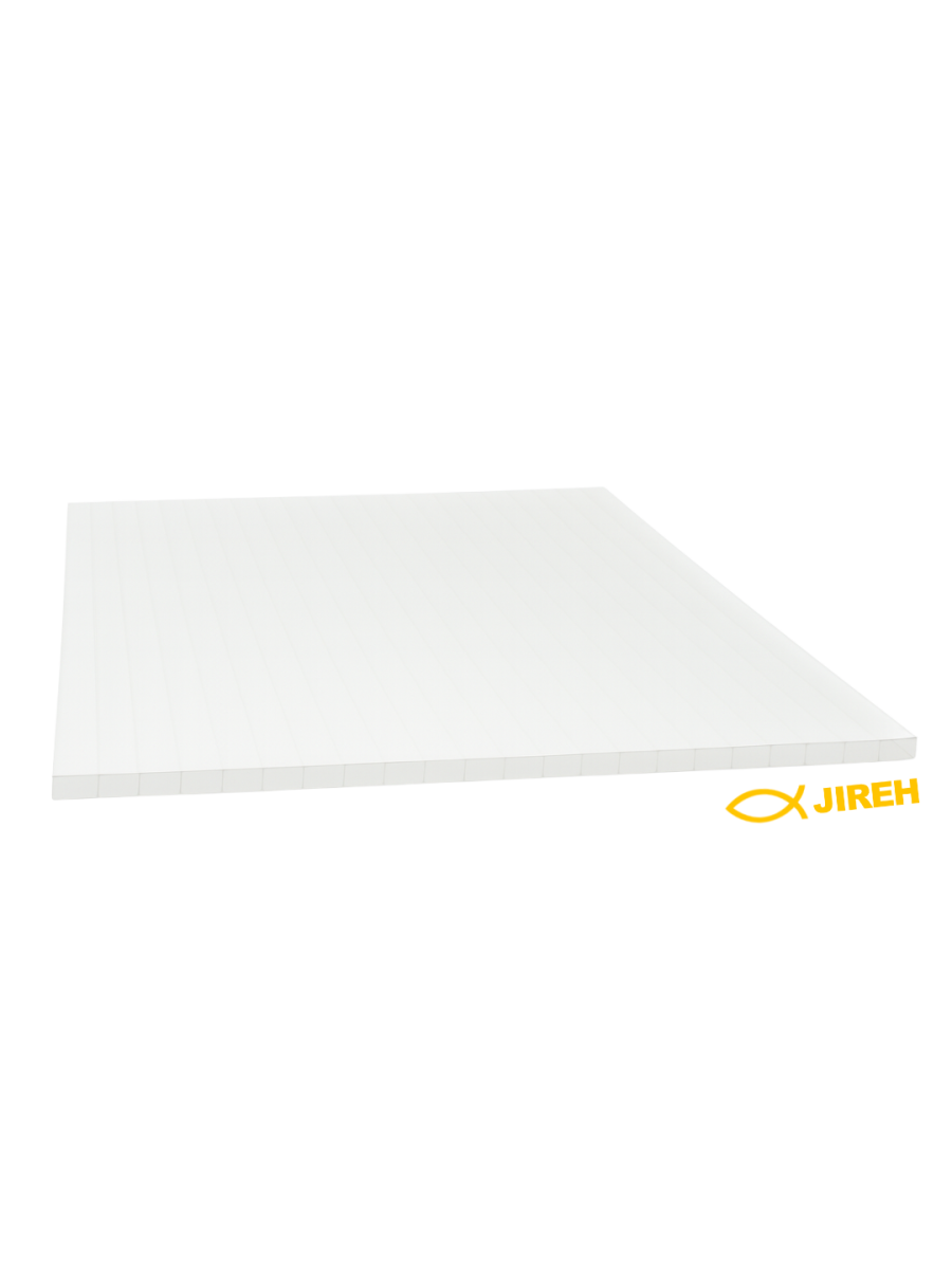 Láminas de policarbonato transparente cumpliendo con todos los estándares de calidad AAA. Es un termo-plástico con propiedades muy interesantes en cuanto a resistencia al impacto, resistencia al calor y transparencia óptica. Vida Útil: Hasta 20 años de durabilidad. Medidas: Variedad de tamaños Jireh, desde 2.95 x 1.05mts. hasta 11.80 x 2.10mts Espesores: Disponibles en 6mm, 8mm y 10mm. Colores: Amplia gama Jireh, desde Cristal hasta Gris Humo y variedad de colores. Beneficios 1. Protección UV: Revestimiento de resina con protección UV en la superficie, lo que bloquea los rayos ultravioleta y no se amarillenta, extendiendo la vida útil del panel y mantiene una excelente transparencia durante muchos años. 2. Resistente al Fuego: Tienen una excelente resistencia a la llama hasta el grado B1, la temperatura es 630ºC. No contribuirá a la propagación del fuego cuando se quema, no genera humo y ni gases venenosos. 3. Transmisión de Luz: La transmisión de la luz de la hoja puede ser hasta del 80%. La hoja de policarbonato alveolar de color evita que la parte más fuerte de los rayos del sol atraviese, por lo que la transferencia de la luz es más suave. 4. Resistencia de Impacto: La hoja de policarbonato alveolar tiene una buena resistencia al impacto y rigidez condiciones de temperatura extremas después de mucho tiempo.